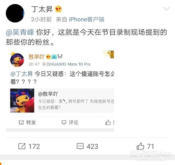 因为粉丝过来理论,丁太升也在微博挂过一些粉丝,专门@吴青峰▼