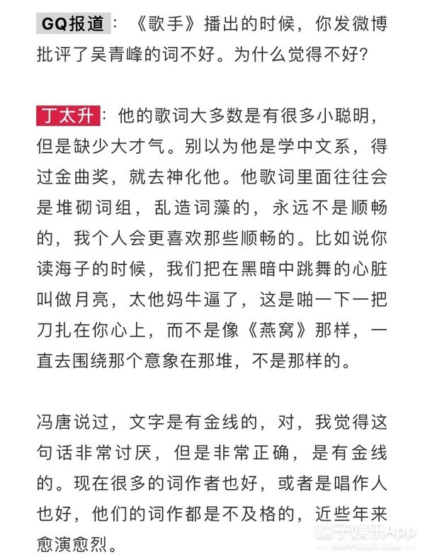 在《GQ》的采访里也回应过青峰的作词水平▼