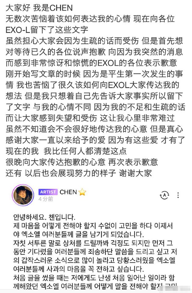 近日,韩国男团EXO成员CHEN(金钟大)在个人社交网站上再发长文,向喜爱自己的粉丝传达歉意:“真心感谢大家一直以来给予的爱,因为有这些爱才有了现在的我,我比任何人都清楚这点。以后也会展现努力的样子,谢谢大家。”