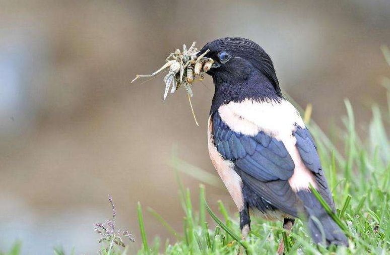 一只粉红椋鸟一天捕食180只蝗虫,繁殖周期内能吃掉2亩地左右的蝗虫。