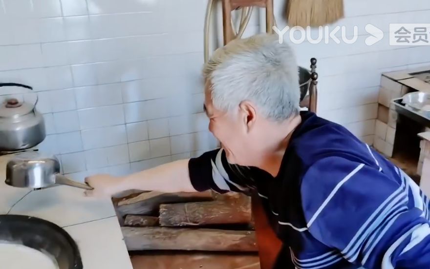 厨房的画风也差不多,本山大叔坐在大锅旁边,不断往灶坑里填着木柴。