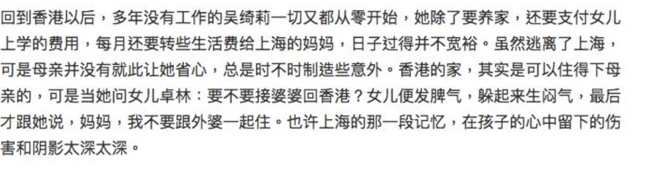 吴绮莉在2001年,独自一人带着孩子移居上海,和母亲一起生活。