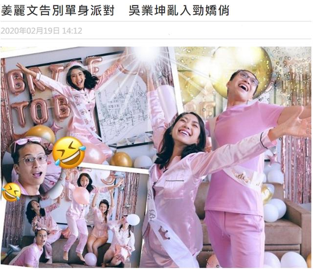传统的告别单身派对上,通常只有女性闺蜜参加,但是在姜丽文的单身趴上,惊现一名男性的身影,原来他是与姜丽文曾经合作拍戏而结缘的TVB演员吴业坤,二人十分合得来,吴业坤作为男闺蜜,派对上也非常拼,穿着粉色衣裤,摆出浮夸的pose拍照。