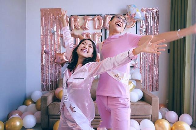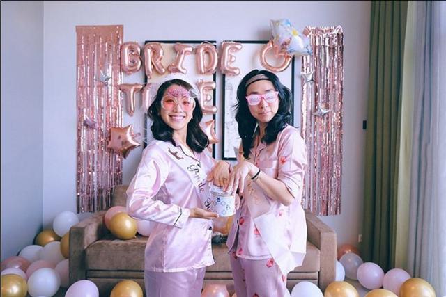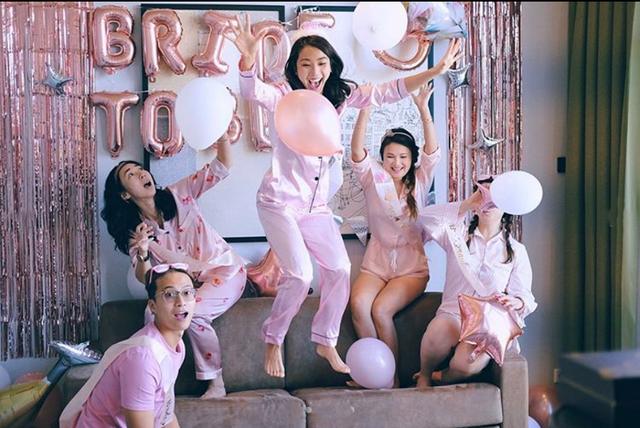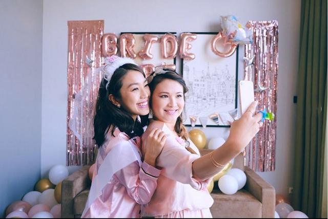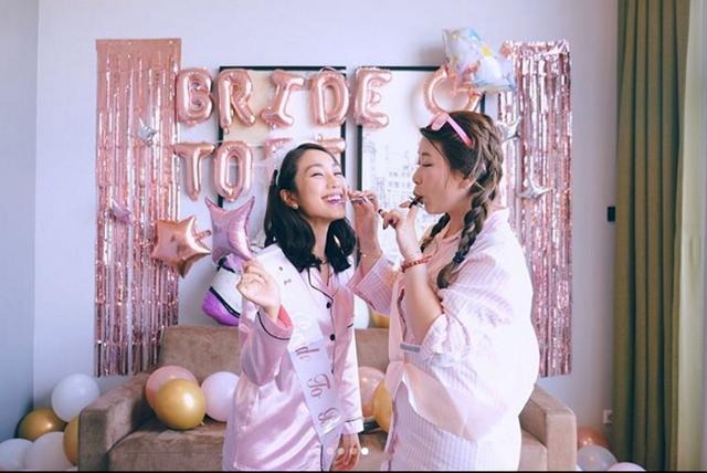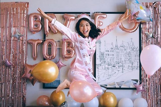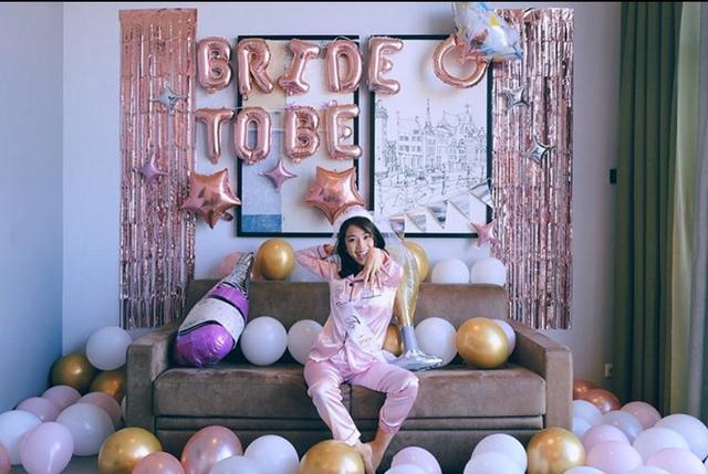 姜丽文的告别单身派对并没有办得很盛大,只邀请了几个好闺蜜,在一个并不大的空间里举行,现场布置少女感十足,到处都是粉色元素,地上也散落了不少金色、粉色与白色的气球,感觉很是温馨。