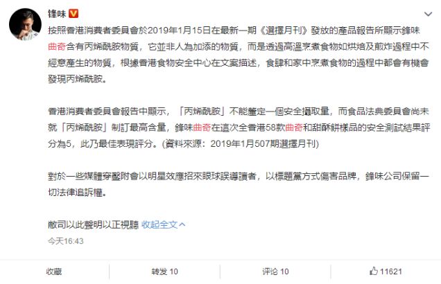 当时事情的转折还要从检测出致癌物说起,因为有刊物通过检测产品,指出谢霆锋旗下的曲奇含有致癌物,糖分更是有超标的现象,消息一出让众人哗然。