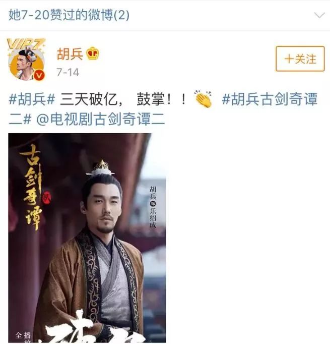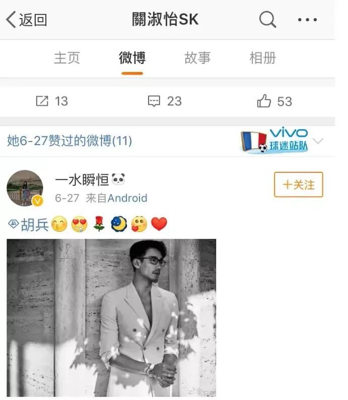 关淑怡之前很喜欢胡兵,关注了胡兵的超话,各种点赞他的微博。