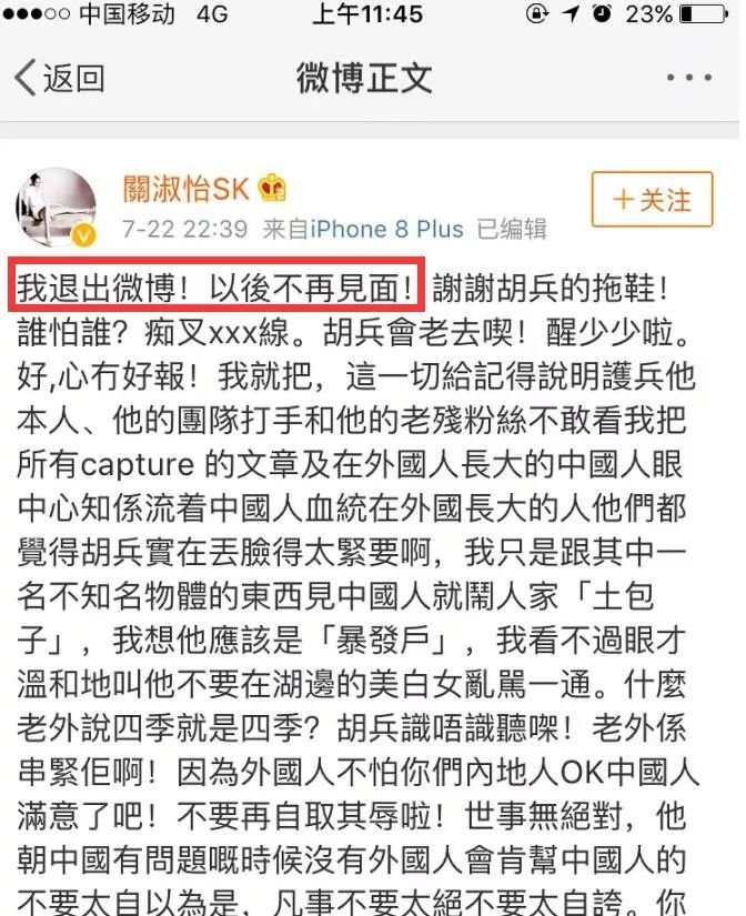 然后关淑怡不知道咋的,看到这段文字,就忽然怒发冲天,说胡兵没有素质,不应该骂酒店,然后关淑怡跟一众微博网友互骂了起来……