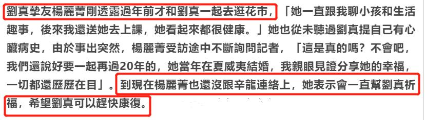 刘真的好友林熙蕾惊讶表示:“吓一跳,衷心祈祷她能渡过难关。”而刘真的另一个好友杨丽菁则透露年前才和刘真一起去逛花市,她也从来没有听过刘真有提自己的心脏病史, 目前杨丽菁也无法和刘真以及辛龙联系上,她表示会一直帮刘真祈福,希望刘真可以赶快康复。