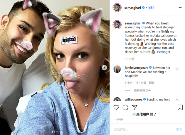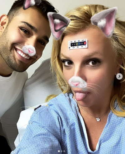 2月18日,布兰妮男友山姆·阿斯加里(Sam Asghari)在社交网站上晒出与布兰妮在医院的合影。穿着病号服的布兰妮兴致勃勃,坐在床上冲镜头吐舌卖萌,还配上狗狗的滤镜。山姆还配文说:“一个人受伤的时候往往会变得更加坚强,尤其是我的妞儿。”