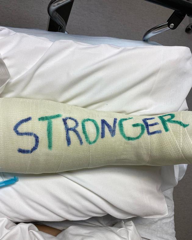 在山姆·阿斯加里晒出的视频里,38岁的布兰妮左腿从膝盖下到脚趾处全打上了石膏,他用笔在石膏上写下“更强”,对此布兰妮由衷地说:“我爱你,谢谢你。”