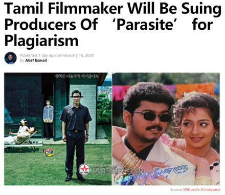 此前,2月17日《今日印度》报道, 印度泰米尔电影制片人PL Thenappan在社交媒体上发帖称奉俊昊导演的《寄生虫》剽窃了自己的电影, 正在准备提起诉讼。