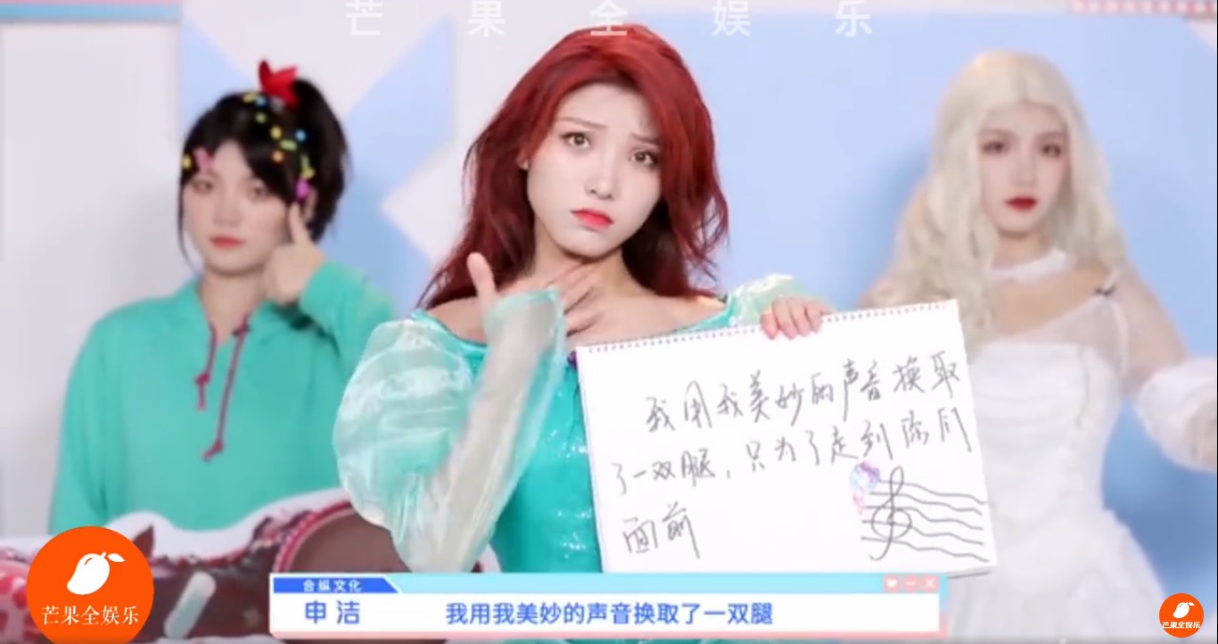 最后是老四美人鱼,申洁。老四最省力,被毒哑了,词都不用背,带了个提示板出来。她写着希望大家能快快记住她,说实话,要是你真不能说话,别说100多个人了,整个娱乐圈我也能记住你。