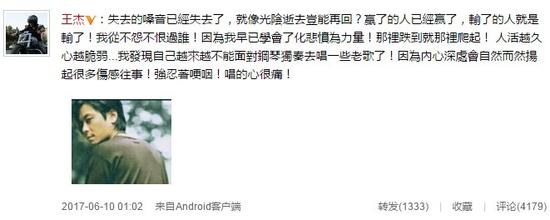 他还在社交平台上写下十分感伤的文字,虽然王杰鼓励自己要坚强,但是失去嗓子的悲痛和遗憾之情还是溢于言表。