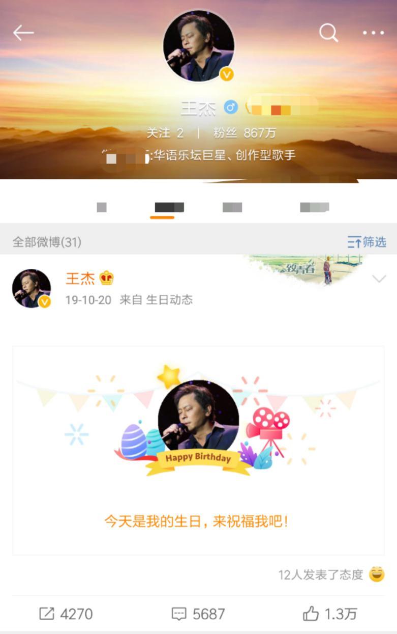 王杰已许久未露面,社交平台认证“华语乐坛巨星”昭示着他曾经的风光无限,而如今他的动态停留在去年,最后一条还是系统自动发送的生日动态,之前的动态也大多是分享美食与心得,俨然普通人的生活动态。