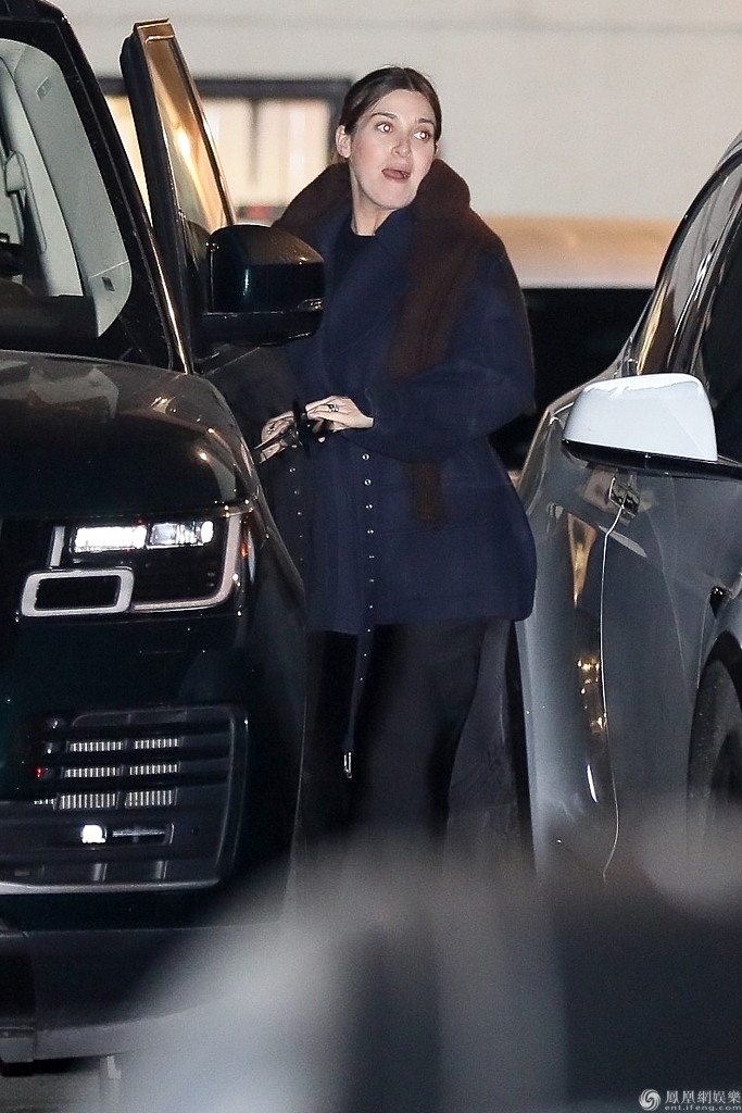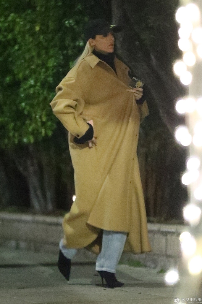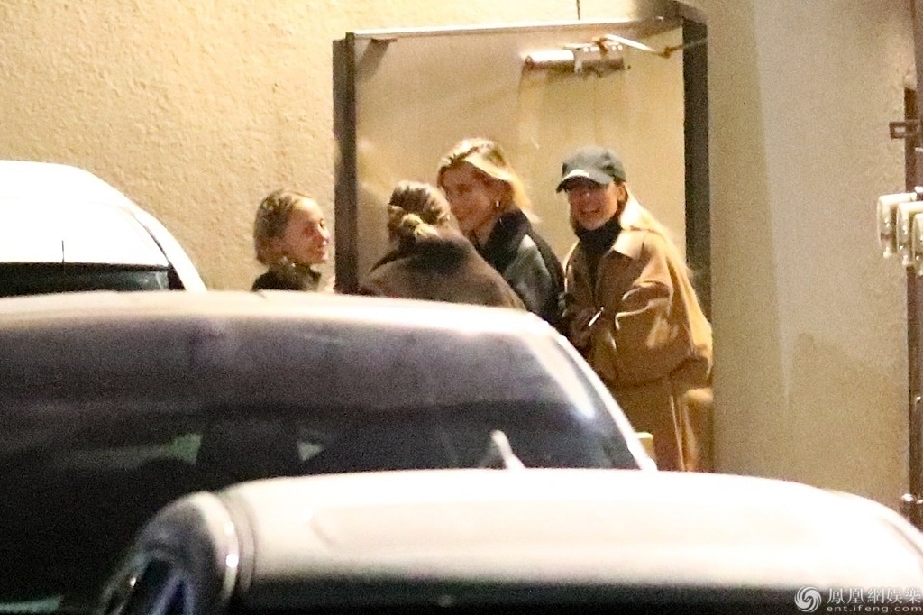 海莉身穿驼色长大衣包裹严实,与几位好友外出通宵十分开心。