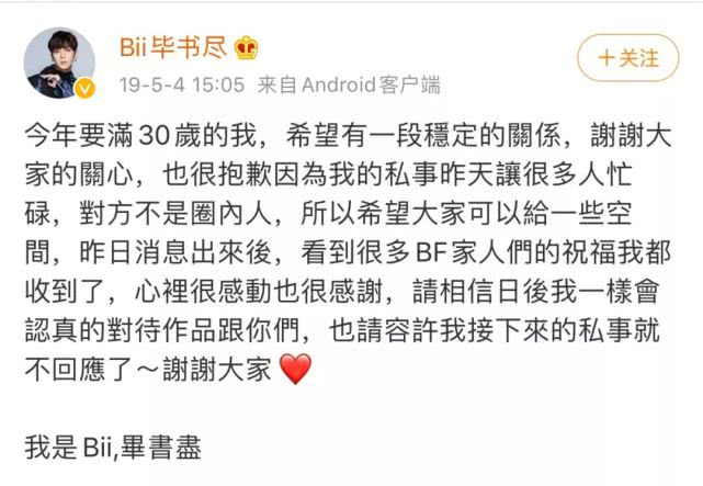 但因为女友是素人,为了保护毕书尽当时没有承认。