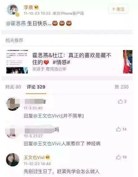 有一次,李晨在微博为霍思燕送上生日祝福,王文也在评论里留言,让霍思燕学学如何做人,此事也一度引起了媒体的关注。