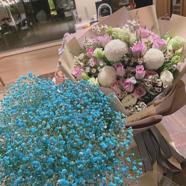 她面前的桌面上放着好几个蛋糕以及几束鲜花,足见她朋友众多,收礼物也收到手软。