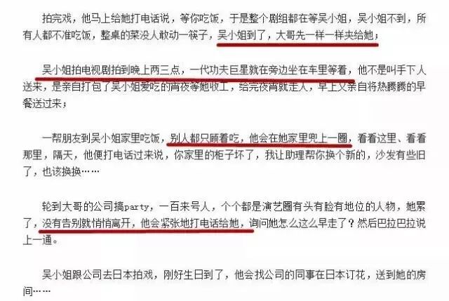 只要吴没有来,整个剧组的人都要陪着成龙等,没人敢动筷子;吴绮莉到了,成龙贴心帮她夹菜。