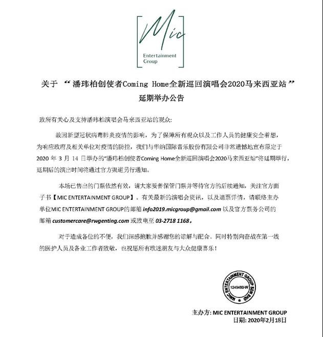 公告表示:“因新型冠状病毒肺炎疫情的影响,为了保障所有观众以及工作人员的健康安全着想,为响应政府及相关单位对疫情的防控,我们与华纳国际音乐股份有限公司非常遗憾地宣布原定于2020年3月14日举办的“潘玮柏创使者Coming Home全新巡回演唱会2020马来西亚站”将延期举行,延期后的演出时间将通过官方渠道另行通知。”