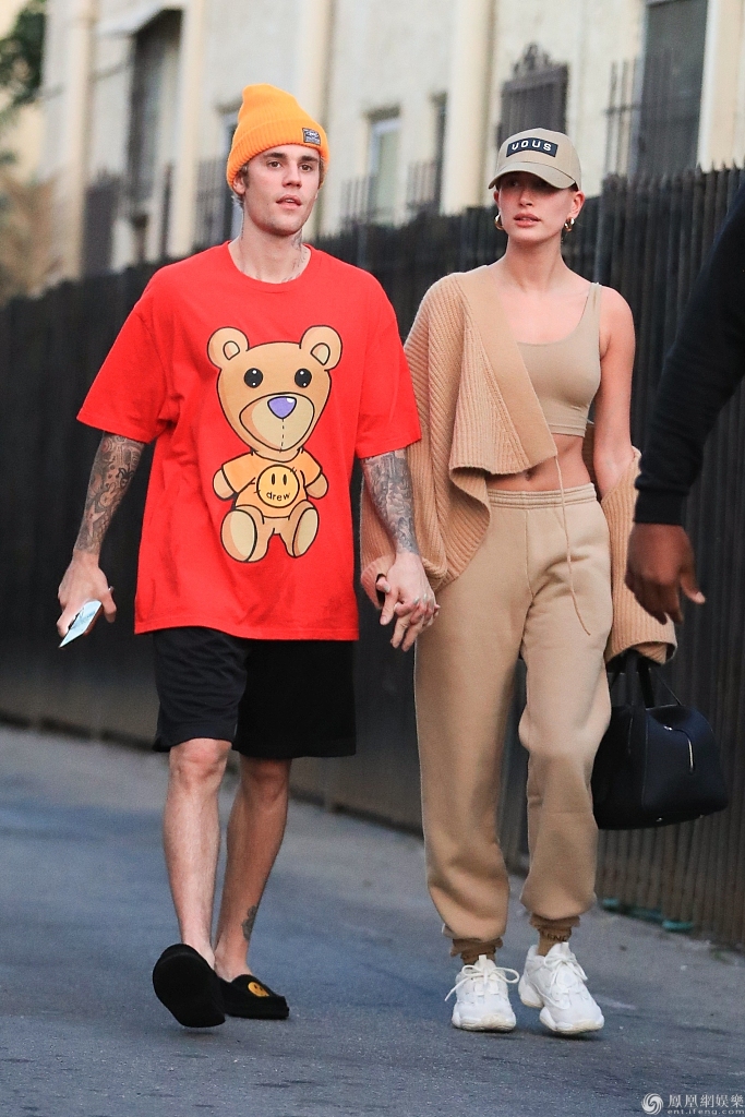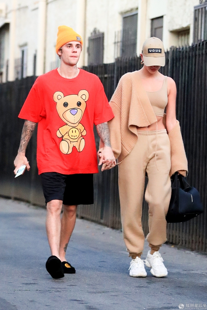 比伯身穿红色小熊T恤戴着黄色尖帽对镜比耶,海莉穿驼色宽松衣衫大秀腹肌,两人牵手漫步十分恩爱。