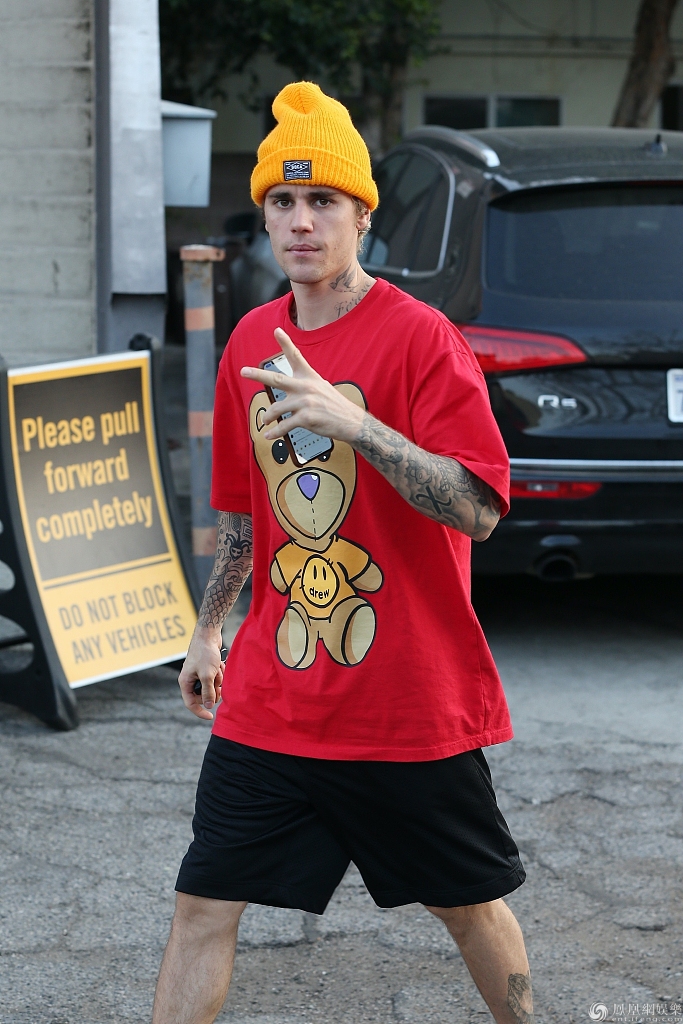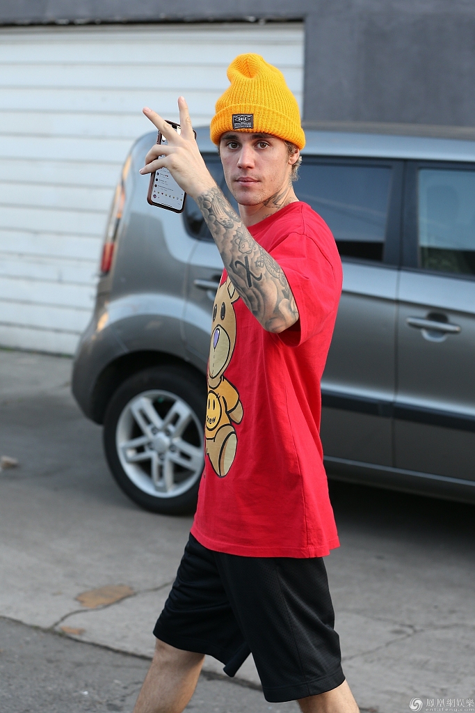 比伯身穿红色小熊T恤,戴着黄色尖帽对镜比耶。