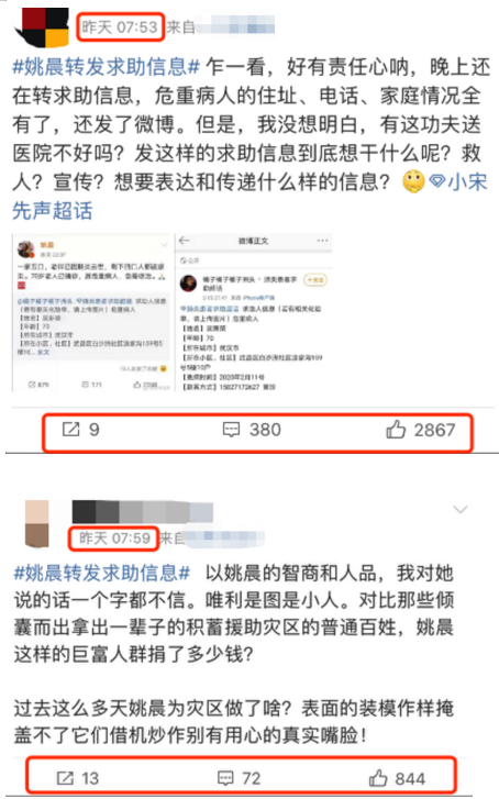综上,骂姚晨买热搜蹭热度洗白不成立,那些说姚晨转发消息就是为了买热搜标榜自己的,基本是无稽之谈,人家从头到尾,都没这个想法。起码在这点上,姚晨冤枉。