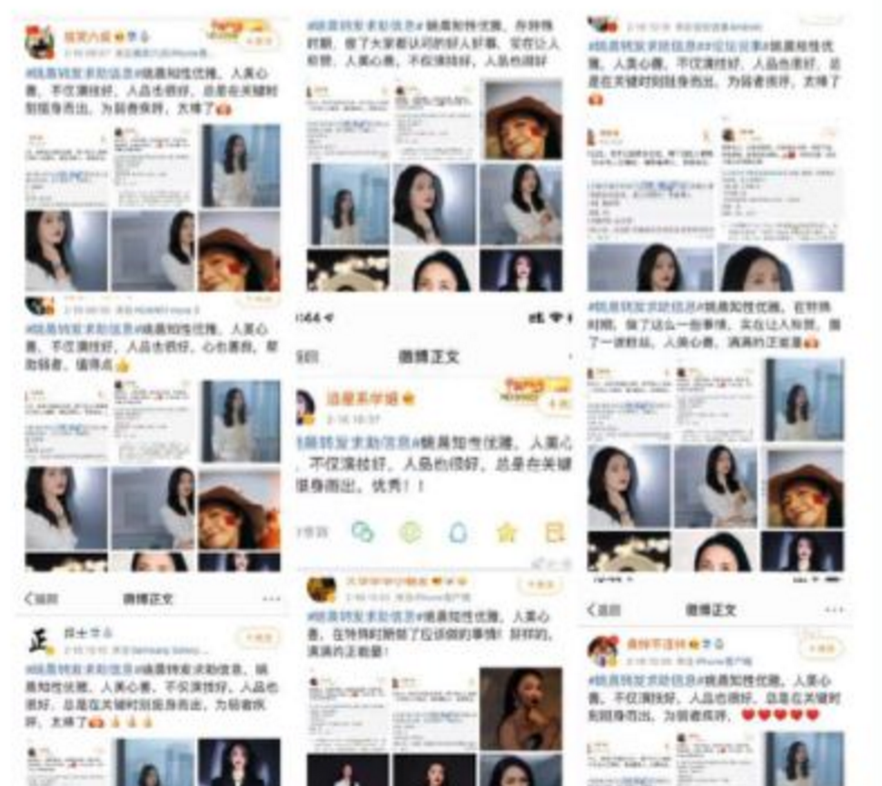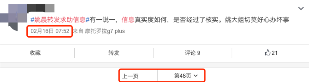 好,既然知道了热搜上榜时间。接下来只要看在7点40前有没有大量营销号发姚晨转发消息就行了。