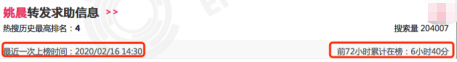 我们来看姚晨这个热搜,热搜词是“姚晨转发求助信息”,这个热搜上榜的时间是可以计算的。