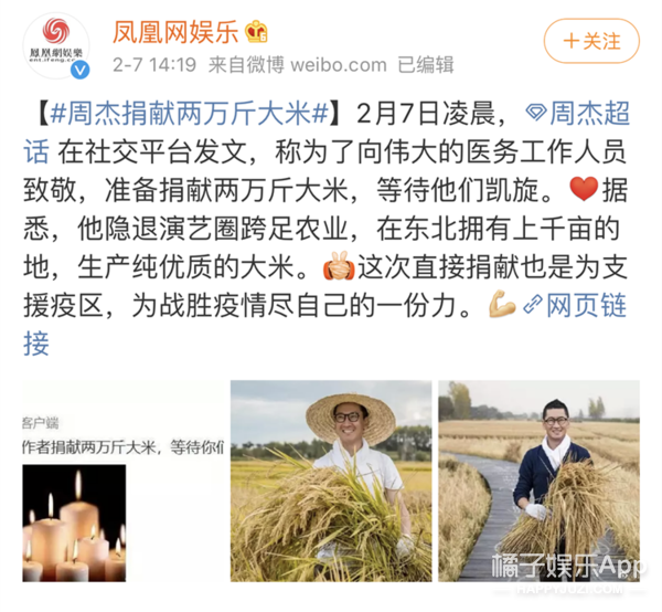你看周杰,靠种地向医护人员捐献了两万斤大米↓