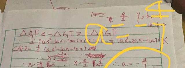 周锐用红色笔将每一步都写的很清楚,期间发现一个值算错了,还特意用黄颜色的笔将正确答案标注在一旁。