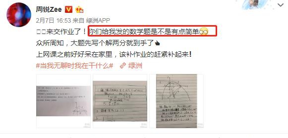 2月7日周锐交出第一波作业,他还说网友给他的作业太简单。之后随文晒出题目与解题过程,他表示解题前先写一个大写的"解"就可以拿到一部分分数,然后按照思路写出具体步骤,最终得到正确答案。