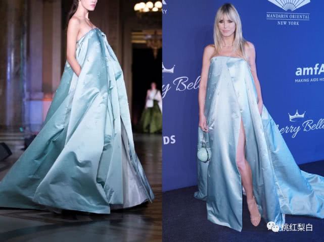 ▲礼服裙:Stephane Rolland 和Devon亮相同场红毯的海蒂,这一身看起来不太妙。 虽然一样是露腿长裙的设计,但是这个仿佛刚从窗帘布上裁下来的蓝色抹胸裙,配上毫无气色的妆发,昔日超模看起来,真的很疲惫了。 头发盘起来可能都会稍微好点?