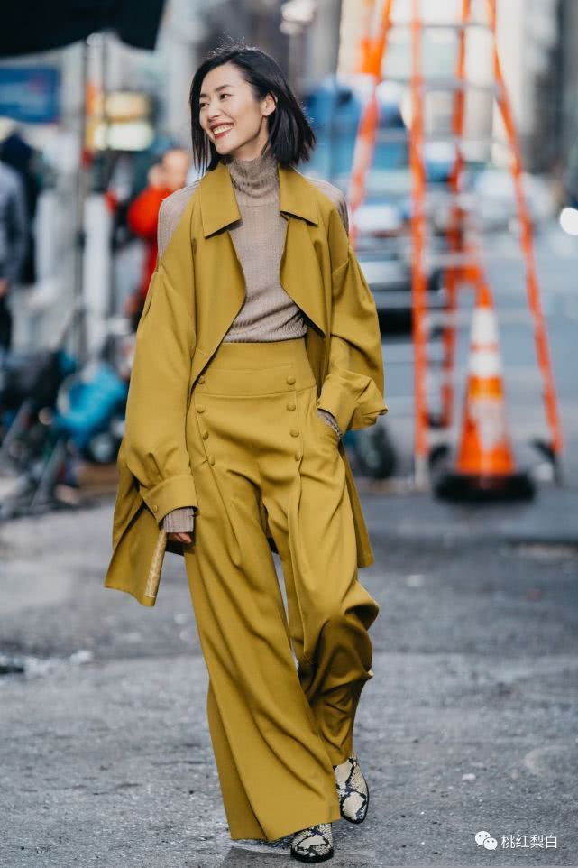 这个亮眼的姜黄色,第一眼看起来就妥妥的抢占全部目光,mix内搭的薄款浅棕色打底衫和蟒纹平底靴,完全的easy chic轻松时髦风。 刘雯去年因为缺席国际四大时装周,引发了一众猜测,还好今年刚开年就在新一季时装周上,看到“劳模”刘雯的熟悉身影了。