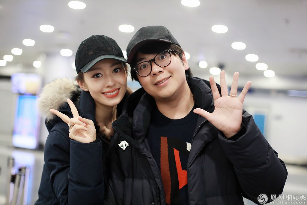 张嘉倪比剪刀手,买超比心,夫妻档配合度满分。