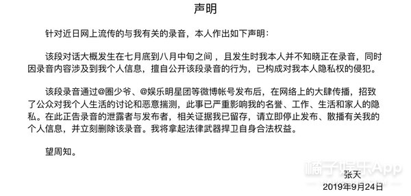 爆出后没多久,张天就主动在微博承认录音确实为本人。