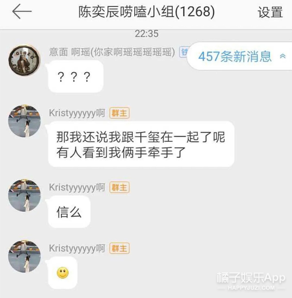 节目播出期间,有人偶遇“天意”牵手逛街,Kristy在群里发微笑脸回应:
