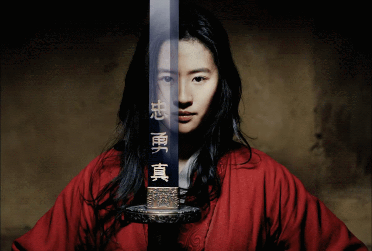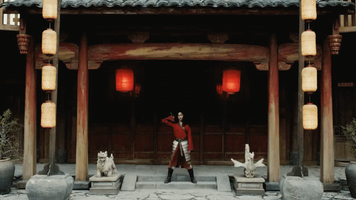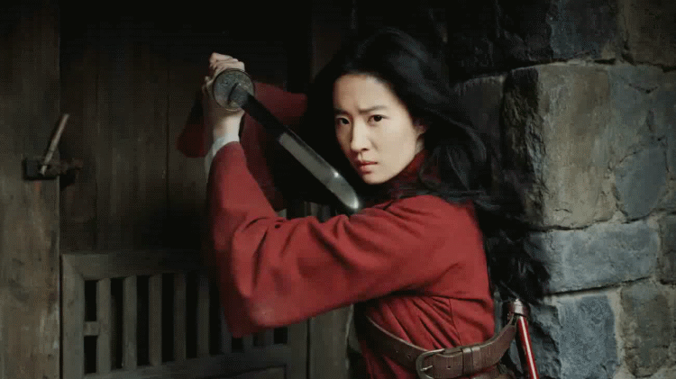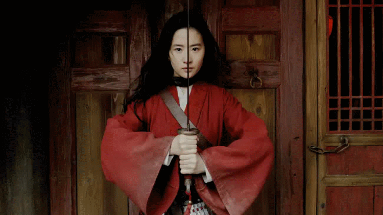 刘亦菲在片中所饰演的木兰持剑以一袭红装登场。发梢和沾满尘土的衣袖随风摆动。