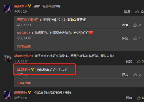 而且在和网友的互动中,甚至说出“用胚胎生了个儿子”的话,虽然没有点名道姓,不过众所周知章子怡在之前刚刚生产完,很显然是有所指。