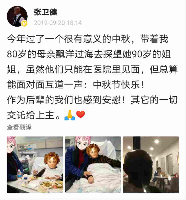 去年,张卫健带着八十岁高龄的母亲漂洋过海去探望她的姐姐,过了一个意义非凡的中秋,由此可见张卫健真的把家人放在第一位。