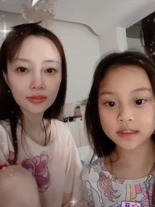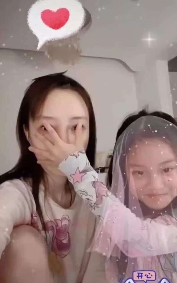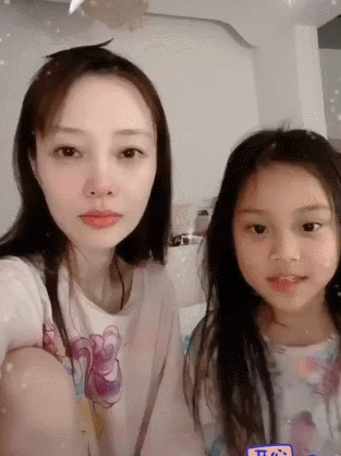 视频中,母女俩玩起了动画特效,但特效头纱一直都戴在李小璐头上。