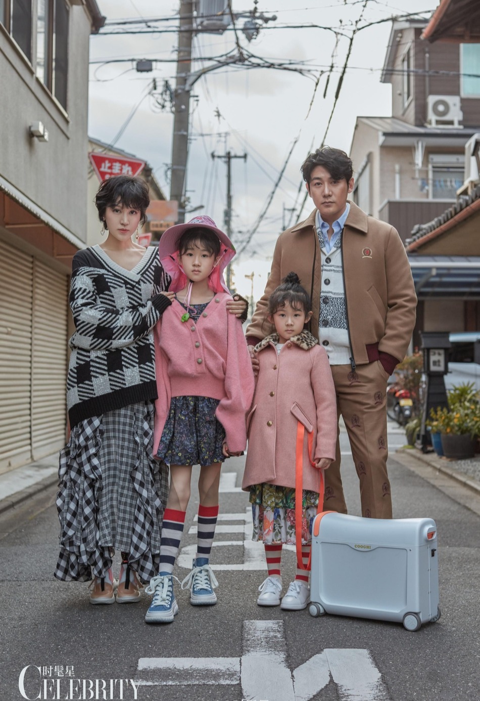 陆毅一家四口于日本京都街头合照,夫妻俩一人搂着一个女儿,一家子高颜值,画面温馨十足。