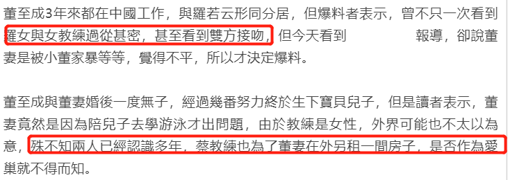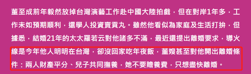 2月12日下午,据台媒报道,台湾男星董至成老婆被曝出了闹离婚的消息,在这场21年的婚姻中,女方曝出了男方的种种不是,今年终于让一顿年夜饭成为导火索大闹离婚,还大喊不要赡养费只想快速离,可谁料女方被曝出了当年同性出轨的消