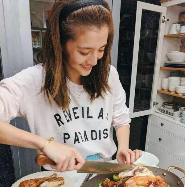 晒出的照片中,吴千语一副素颜,头上戴着一条黑色的发箍,身穿白色睡衣十分自在,当时的她正在厨房内右手持刀对着一只烹饪好的鸡进行分割,虽然手持利刃但她看起来却十分开心。