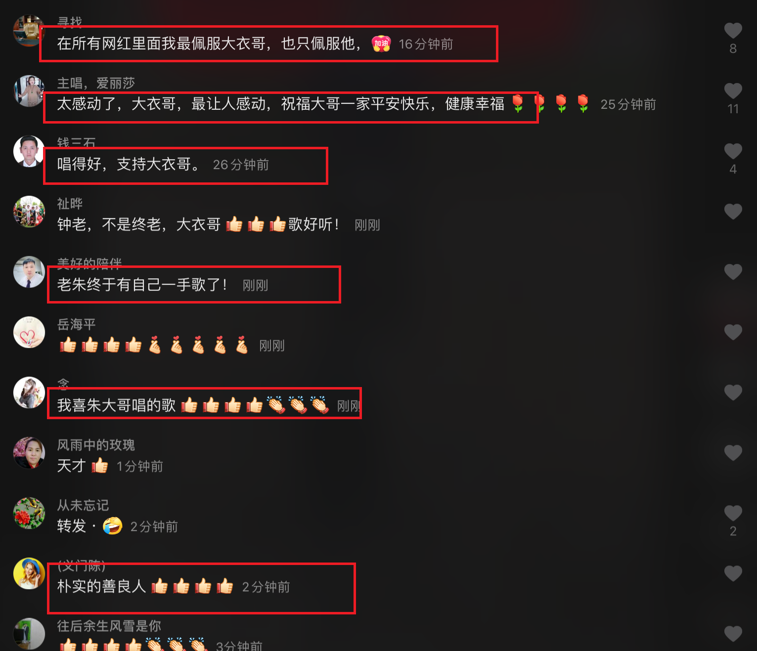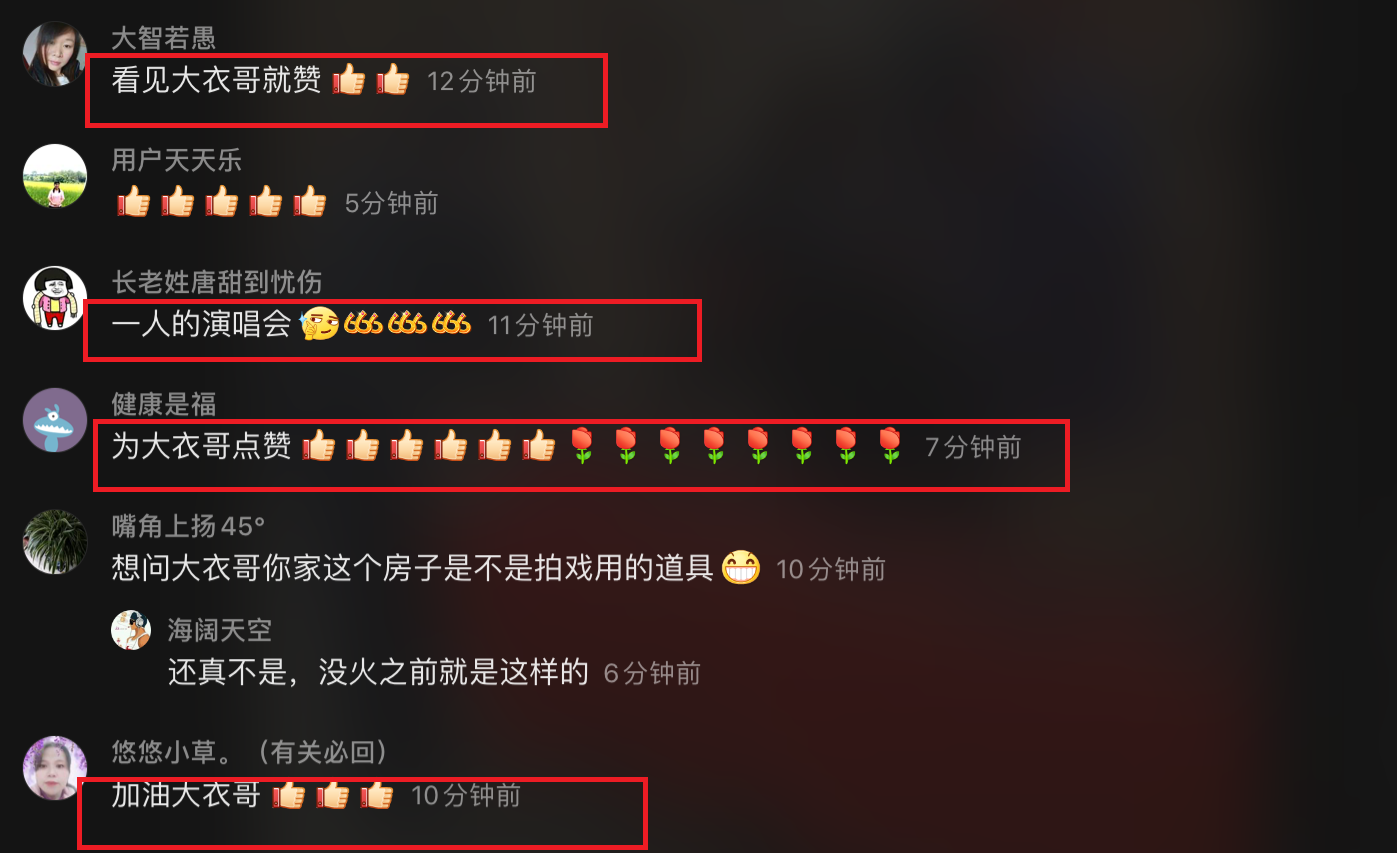 很多网友看到这段视频,纷纷表示,“看见大衣哥就赞”、“一人的演唱会”、“为大衣哥点赞”、“在所有网红里面我最佩服大衣哥,也只佩服他”、“太感动了,大衣哥最让人感动”、“唱得好,支持大衣哥”、“朴实的善良人”。