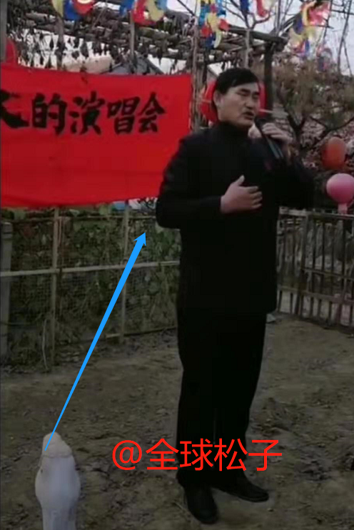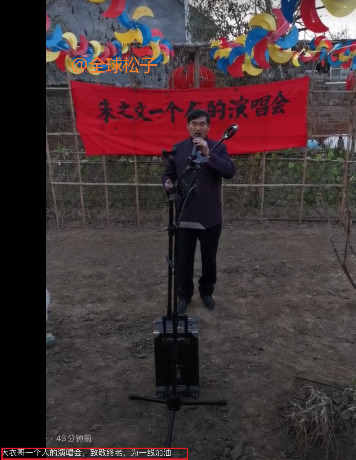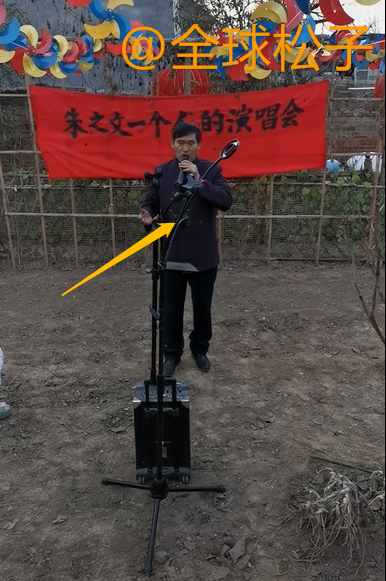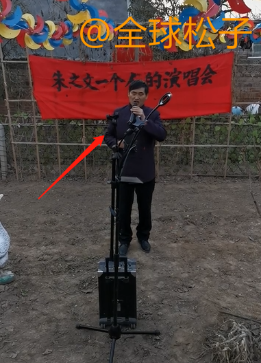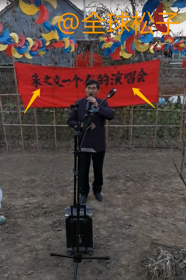 从视频中可以看到,大衣哥面对镜头,手里拿着话筒站在那里唱歌,前面还有音响,看上去颇有架势。大衣哥的身后还有一块红布,上面有写着“朱之文一个人的演唱会”。