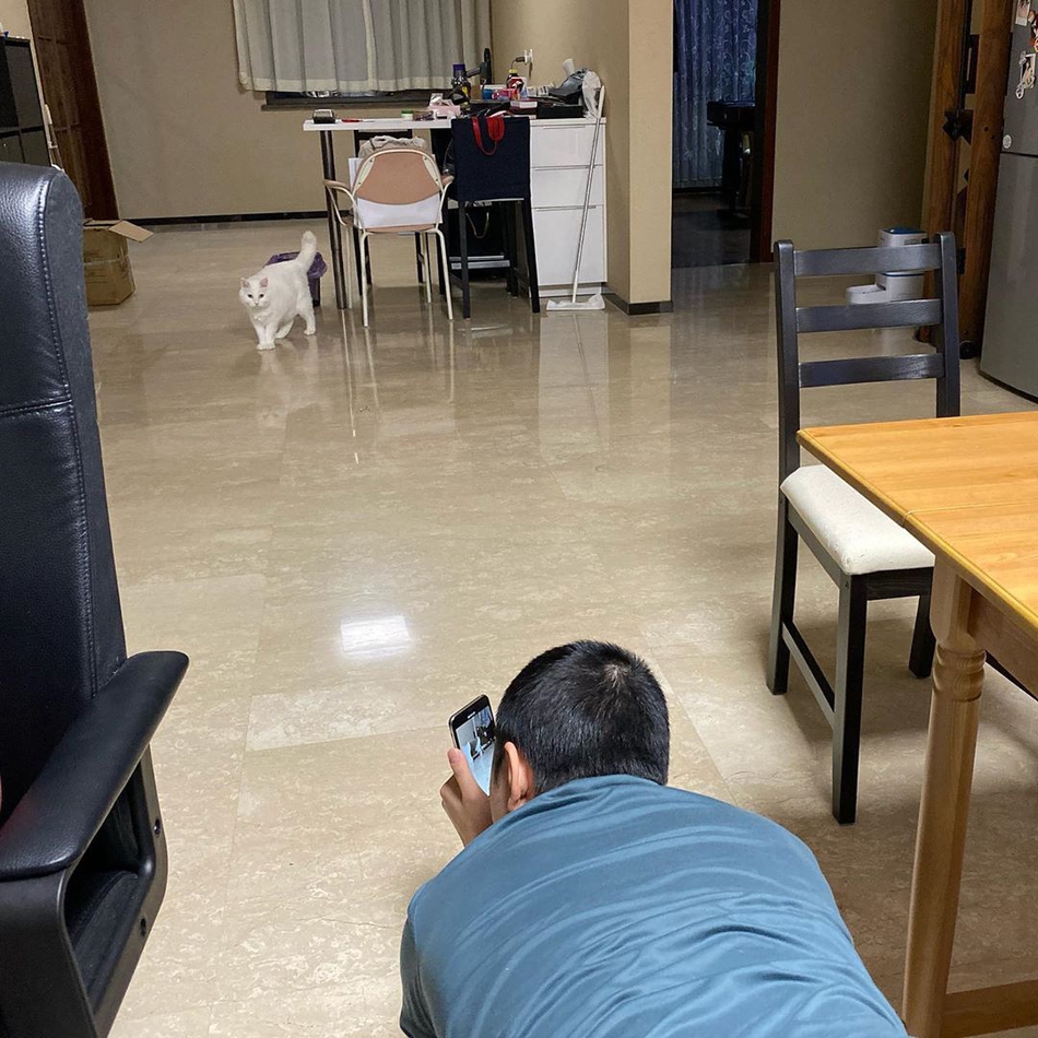 papi酱称:“身穿家居服的老胡趴在地上双手举着手机,正在给猫咪拍照,看起来十分辛苦”。随后还感慨,“不容易的老胡”。