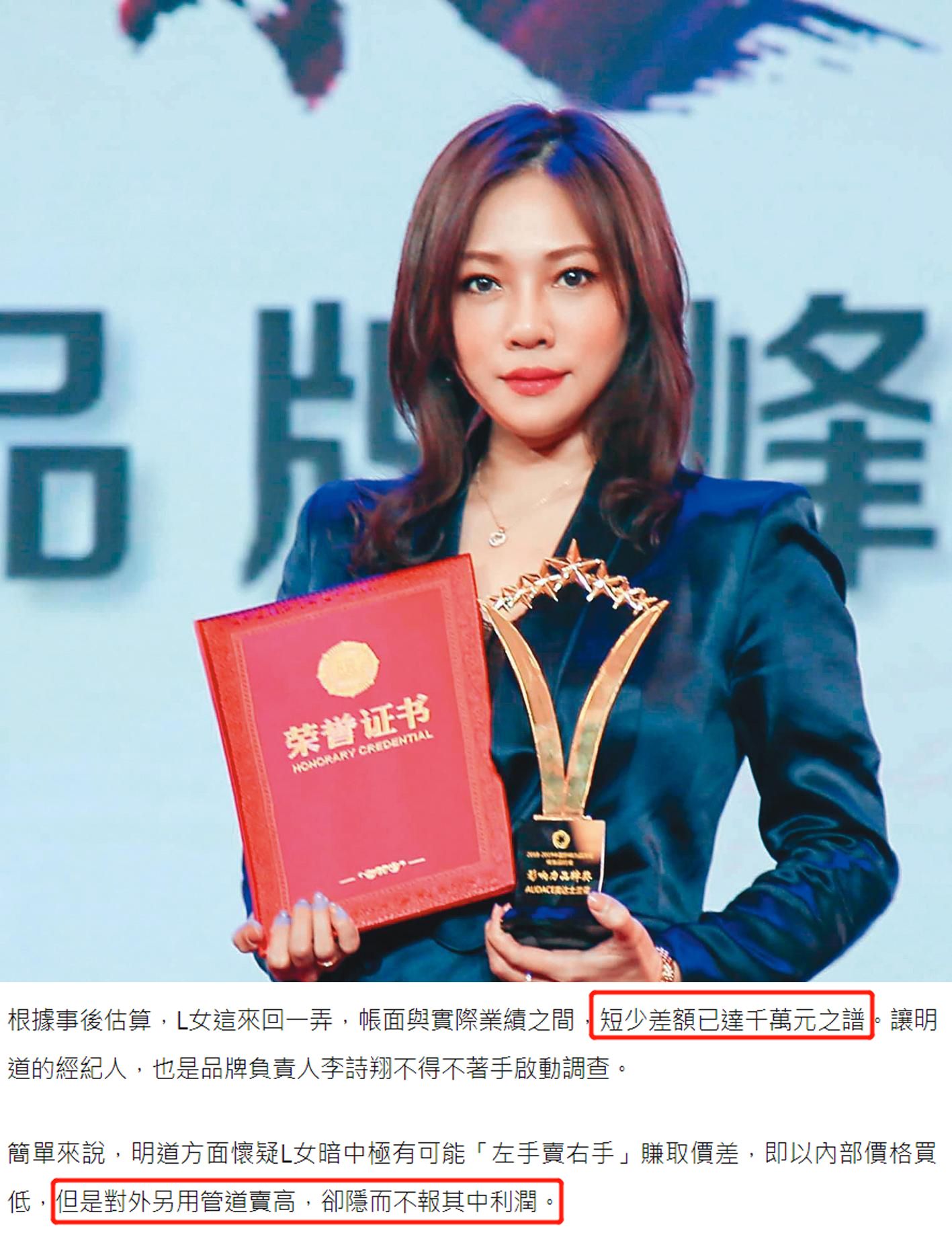 根据知情人爆料,这位L女同小S老公交情颇深,但账目不清,甚至数额高达千万,疑似暗中赚取差价,导致明道的经纪人也是这个品牌的负责人质问,小S老公许雅钧却出演袒护,引来轩然大波。