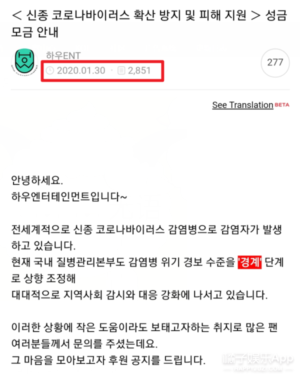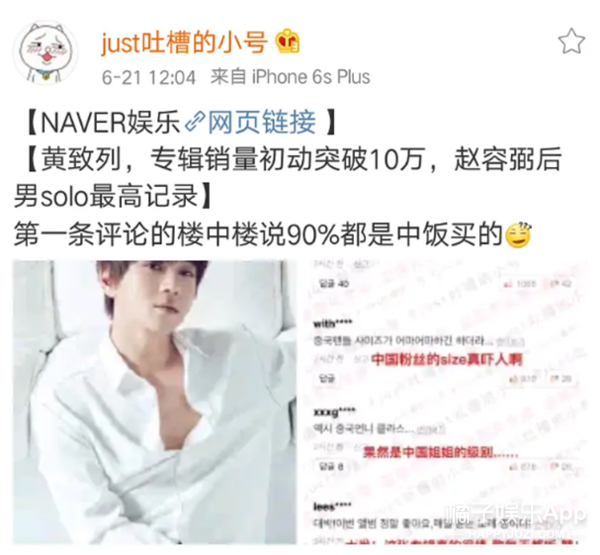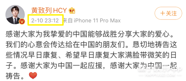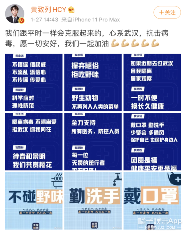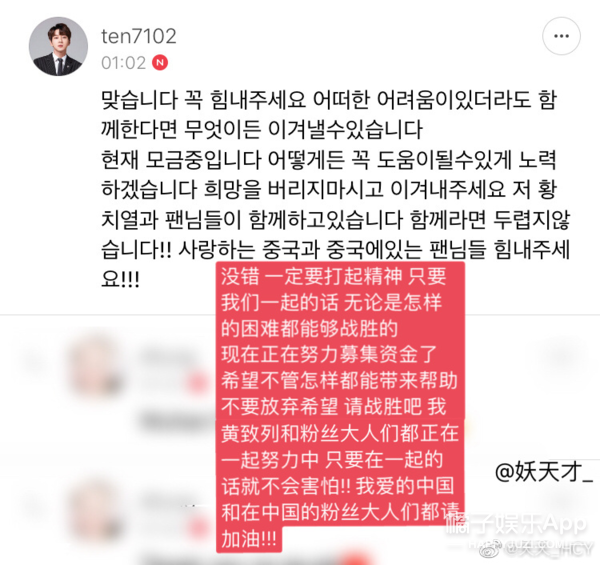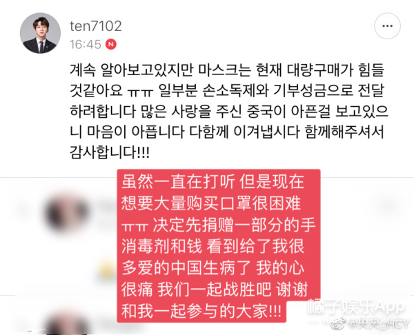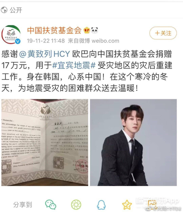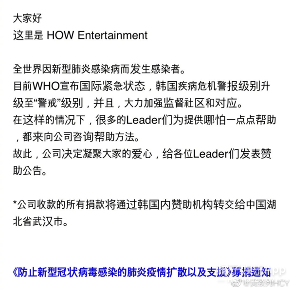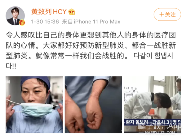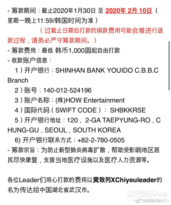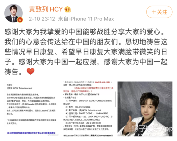 黄致列和韩国粉丝一起募集善款,捐给武汉,他特地发微博,表示对中国朋友的支持。