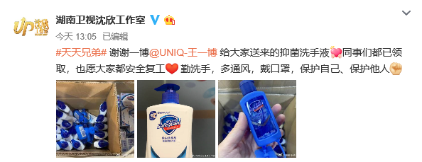 2月11日,《天天向上》节目组晒出一箱洗手液的照片,并配文:“谢谢一博给大家送来的抑菌洗手液,同事们都已领取,也愿大家都安全复工。勤洗手,多通风,戴口罩,保护自己、保护他人”。